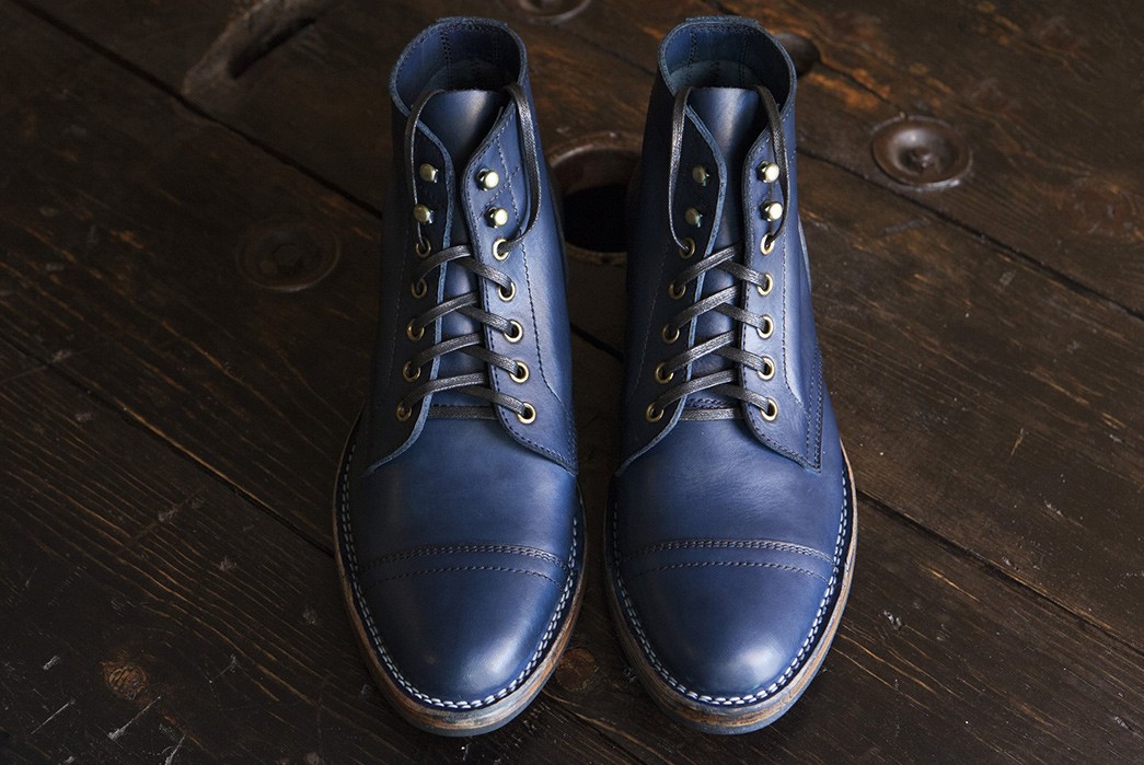 This boot was the result of Pigeon Tree Crafting‘s first collaboration with Indonesian Bootmaker, Santalum, back in 2018. After selling out rapidly. PTC is back with a hyper-limited run. These veg-tanned leather service boots are made in Indonesia and then sent to Pigeon Tree, where they are dyed deep indigo, right down to the Dainite sole. PTC has been working on their leather indigo dyeing for some time, and the fruits of their labors are evident in these glorious indigo beauties.